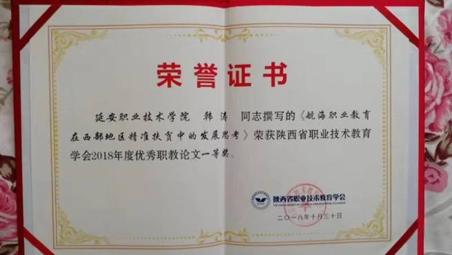 韩涛老师撰写的《航海职业教育在西部地区精准扶贫中的发展思考》论文在2018年陕西省职业技术教育学会高职学术年会上获得优秀论文一等奖。