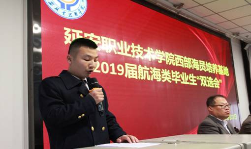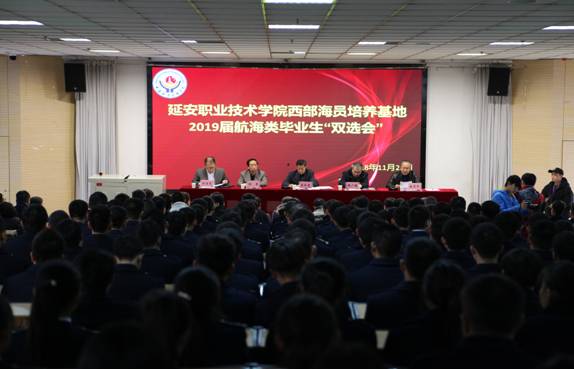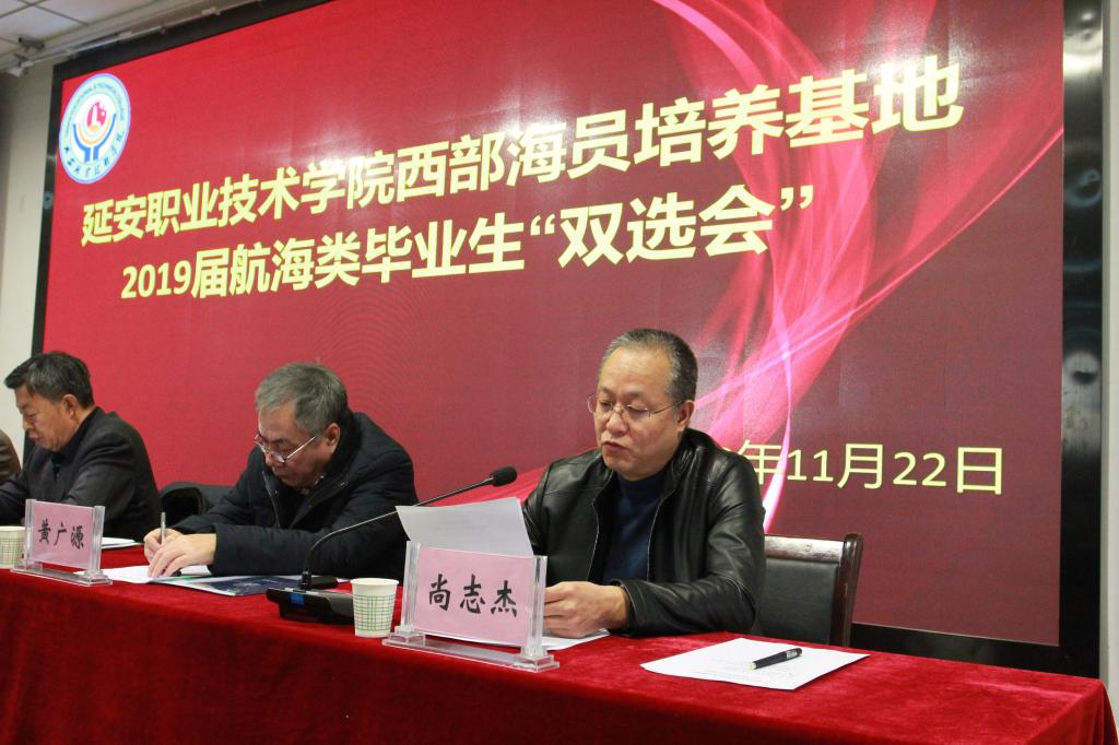 11月22日上午,延安职业技术学院西部海员培养基地2019届航海类毕业生“双选会”在第一阶梯教室举办。天津海事局副巡视员王长青、天津市船员服务行业协会秘书长黄广源、船员处副处长刘宝庆、延安老区建设促进会副会长王星、延安老区扶贫开发局党组成员、总农艺师闫建华等出席了会议。华洋海事中心等八家航运企业以及大连海事大学等六家支教院校参加了会议。会议由学院副院长尚志杰主持。