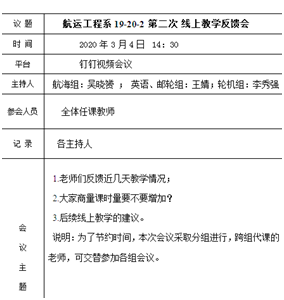 2.老师们建议引用航海类专业国家资源库的资料,结合学生的学情,扩充教学内容;借助这次在线教学加快我们专业教学资源库建设;专业课作业可使用“船员通”APP进行布置和批阅,内容宽泛批改及时反馈到位。
