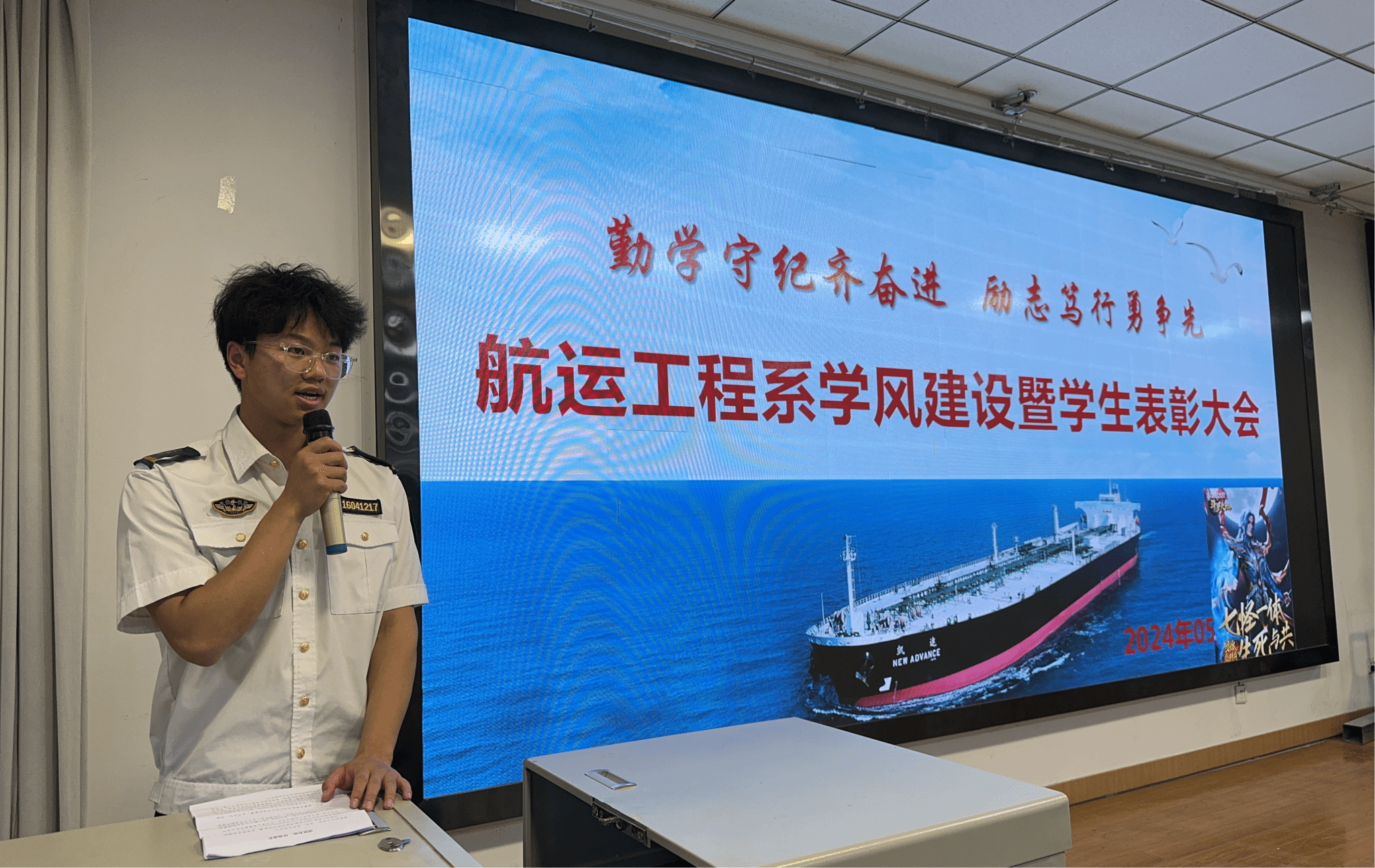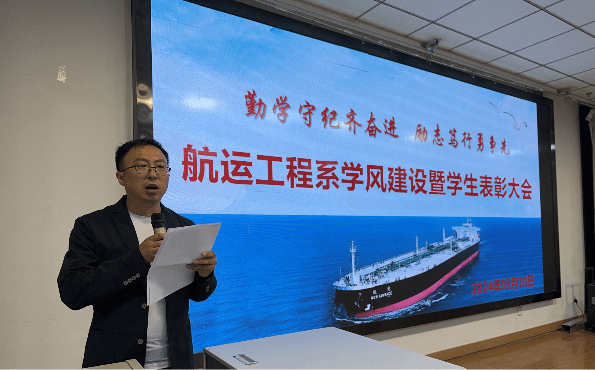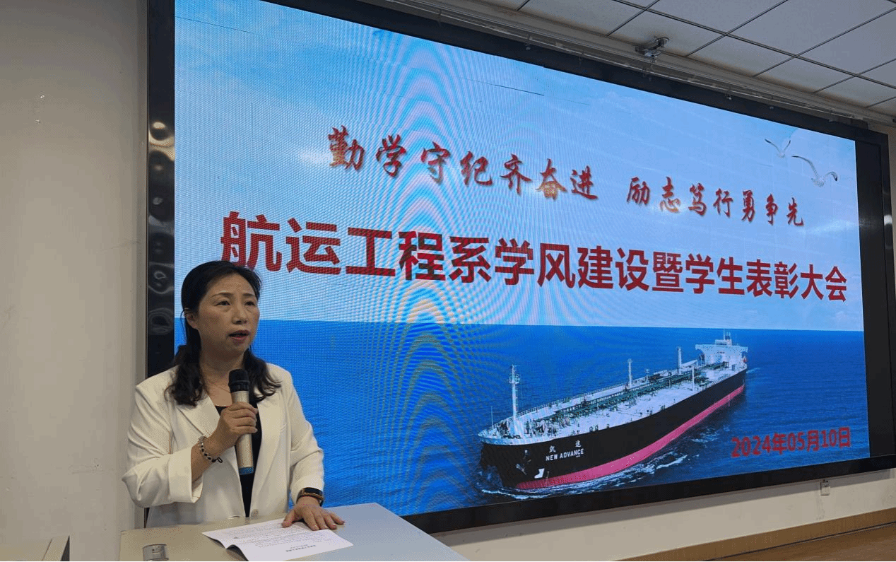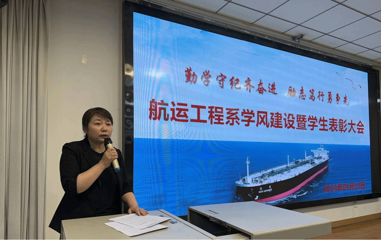 为进一步创建“比、学、赶、帮、超”的良好氛围,5月9日下午,航运工程系在第一阶梯教室召开了以“勤学守纪齐奋进,励志笃行勇争先”为主题的学风建设暨学生表彰大会。会议由系党总支书记李烨主持,学院学生处副处长屈小刚,航运工程系行政管理人员、辅导员、全体学生参加了会议。