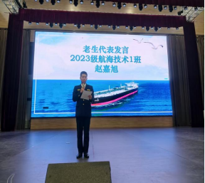 在学生代表发言环节,新旧学子接力发声, 2023级赵嘉旭作为老生代表,结合自身备战2025年世界职业院校技能大赛争夺赛的经历,分享了以赛练技、以学促行的实践感悟:“备赛时反复打磨船舶交通运输实操细节,让我明白航海技能容不得半点马虎,也希望学弟学妹们锚定航海领域目标,把课堂知识转化为过硬实操能力,让奋斗成为专业成长的底色。”2025级吴彤作为新生代表则满怀憧憬表态,将以“虚心求教的态度学知识,以敢闯敢试的劲头练本领,主动参与专业实践、夯实理论基础,用朝气蓬勃的状态展现出新生不负韶华、逐梦前行的青春风貌”。